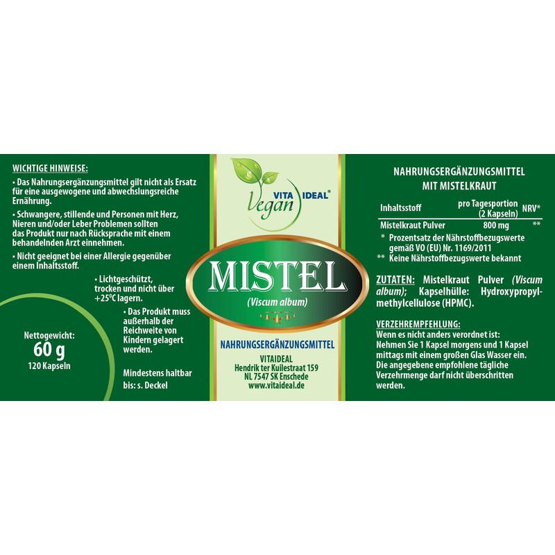 - Ingredients: Mistletoe powder (Viscum album), vegetable capsule shell: hydroxypropylmethylcellulose (HPMC). Our powders are natural, vegetable and without additives.