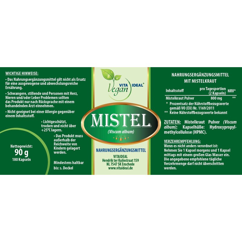 VITA IDEAL Vegan® Vitaideal Mistletoe Herb 180 Capsules - Viscum Album - Mistletoe Daily Serving 800 mg Pure Natural Powder without Additives Original