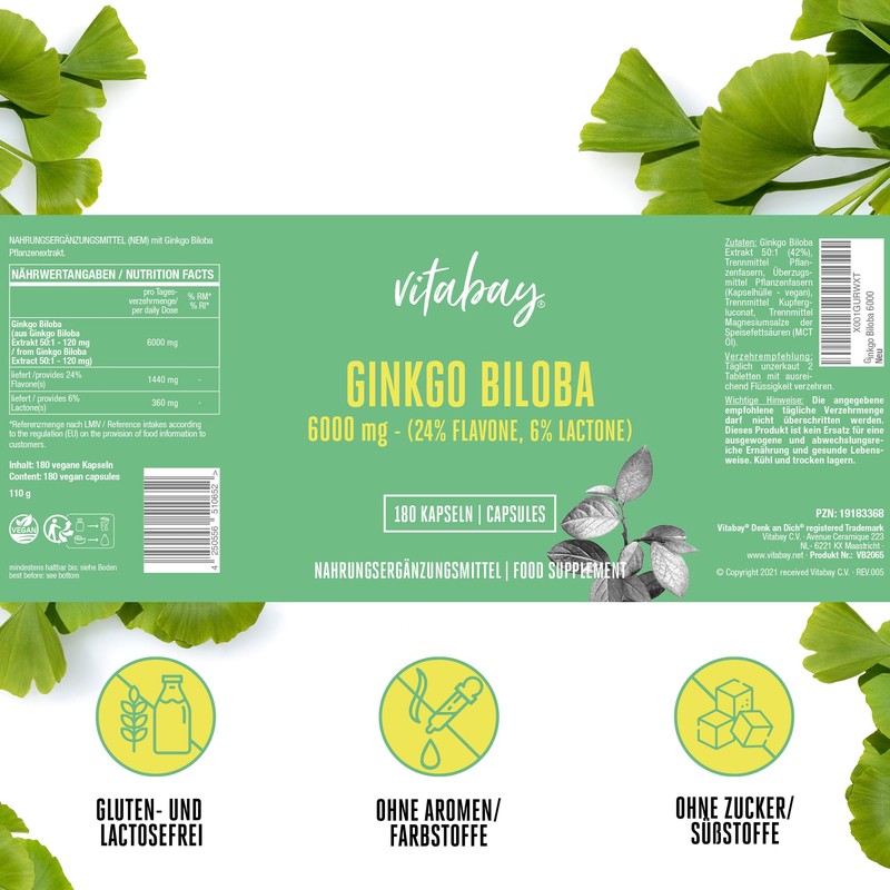 Vitabay Ginkgo Biloba 6000 mg, 365 tablets, time-optimised release, with 24% flavone and 6% lactone, laboratory tested and made from high-quality raw materials