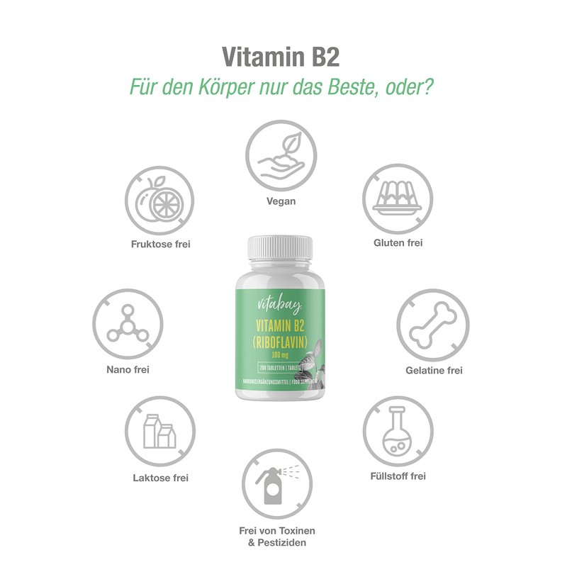 Vitabay Vitamin B2 (Riboflavin) | 200 Vegan Tablets | High Dose with 100 mg | Laboratory Tested & Made from High-Quality Raw Materials