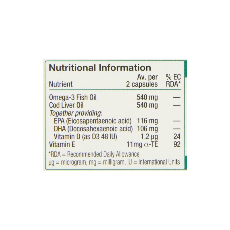 Product DescriptionUltra 2-in-1 capsules contain a super strength marine oil formula that conveniently provides the benefits of both omega-3 fish oil and cod liver oil in a 50:50 ratio. All Ultra products (excluding Ultra Vit B Complex) can be taken alongside any multinutrient product in the Vitabiotics range for that additional boost. Ultra 2-in-1 Capsules contain vitamin E, which contributes to the protection of cells from oxidative stress and helps to protect the high purity oil. Provides Vitamin D, best known for its role in the maintenance of normal bones & teeth & contributes to the normal functioning of the immune system. Ultra 2-in-1 capsules provide rich sources of the essential fatty acids, DHA (Docosahexaenoic acid) together with EPA (Eicosapentaenoic acid)IndicationsGenerally Ultra? Fish Oils can be taken alongside medications. However, for specific advice on taking Ultra? Fish Oils with medicines, we recommend that you contact your doctor or pharmacist first.IngredientsIngredients: Cod Liver Oil (from FISH), Omega-3 Fish Oil (from FISH), Capsule Shell (Pharmaceutical Grade Gelatin [Halal Bovine Source], Glycerin, Flavouring: Orange Oil), Vitamin E (D-Alpha Tocopherol), Vitamin D (Cholecalciferol [Medium Chain Triglycerides, Antioxidant: DL-Alpha Tocopherol]).DirectionsTake two capsules per day with a meal. Swallow with water or a cold drink such as milk or orange juice, not a hot drink as this may cause the capsules to disintegrate too early. Not to be chewed. Do not exceed recommended intake.Safety WarningAlways read the product directions before use. Do not exceed the recommended intake. As with other supplements, seek professional advice before using if you are pregnant, breastfeeding or suffer from food allergies, or are allergic to fish or fish products . If you have epilepsy or are taking oral anti-coagulants (e.g. warfarin) consult your doctor or pharmacist before using this product. Vitamin supplements are not intended to treat or prevent any disease. Food supplements must not replace a balanced and varied diet, and a healthy lifestyle.Box Contains60 capsulesManufacturer Contact InformationVitabiotics Ltd, 1 Apsley Way, London NW2 7HF, United Kingdom