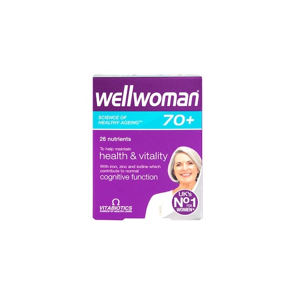 Specially formulated to help provide the nutritional needs of women aged over 70, Wellwoman 70+ contains a range of 26 vitamins and trace elements. Part of the Vitabiotics Wellwoman range, the 70+ formula includes vitamin C, B12 and D plus zinc and iron, all contributing to normal energy release, normal functioning of the nervous and immune systems.