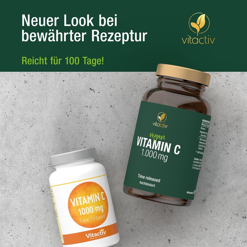 VITACTIV Vitamin C TIME RELEASED - Vitamin C Hochdosiert plus Natürliches Hagebutten Extrakt - Vegan, Zuckerfrei, Hohe Bioverfügbarkeit - Laborgeprüft in Deutschland, 100 Vitamin C Tabletten