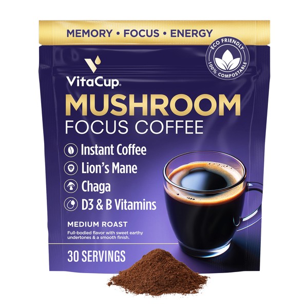 - Ultimate Cognitive Support: VitaCup Mushroom Focus Instant Coffee enhance your focus and clarity using a premium blend of lion’s mane and chaga mushrooms, fortified with B vitamins, promoting optimal cognitive function while offering the rich, robust flavor of a medium roast.