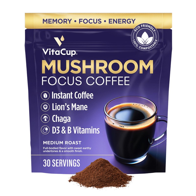 VitaCup Focus Mushroom Instant Coffee | For Memory & Clarity Support | with Fiber, Chaga, Lion’s Mane | D3 & B Vitamins | Medium Roast 100% Arabica & Robusta Instant Coffee | 30 Servings