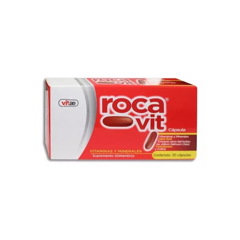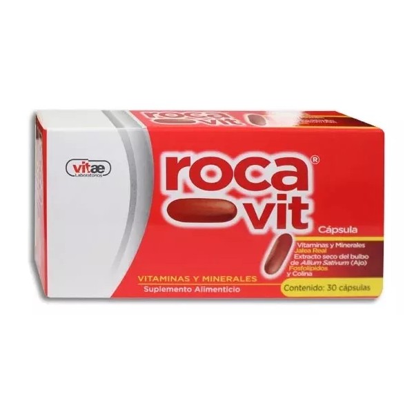 "Roca Vit Cápsula, 30 Cápsulas Vitaminas y Minerales" es un suplemento dietético que contiene una combinación de vitaminas y minerales. Aquí tienes una descripción general de este producto: