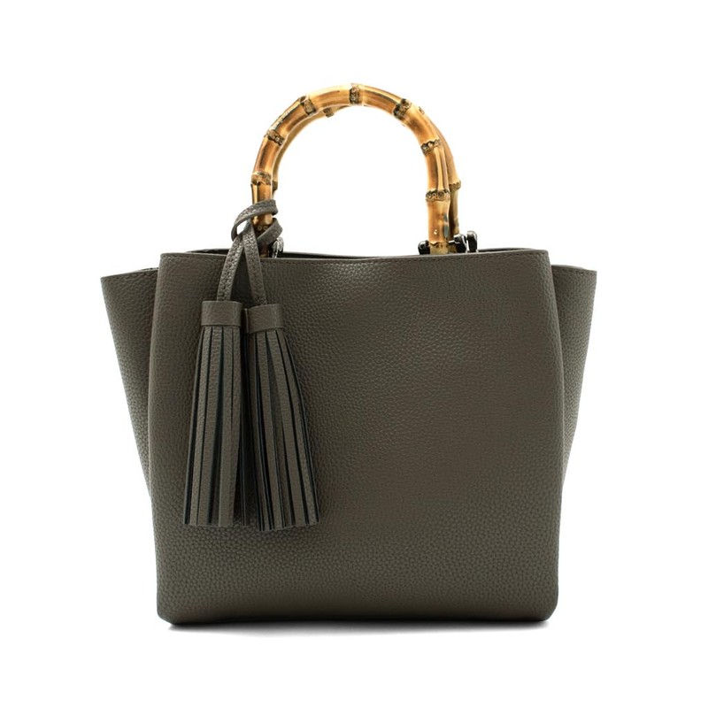 - A simple square shaped handbag with a natural texture accented with a bamboo handle. Made of thick faux leather with a grain and bamboo handle for an elegant look. Compact appearance and practical size for storing essential items. The included shoulder strap can be detached and used as a shoulder bag. Three storage compartments inside the bag for easy organization. This handbag is easy to match with both clean and casual styles