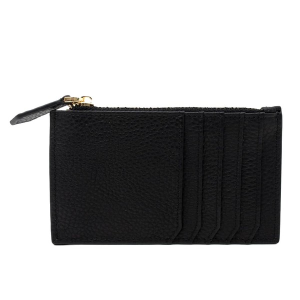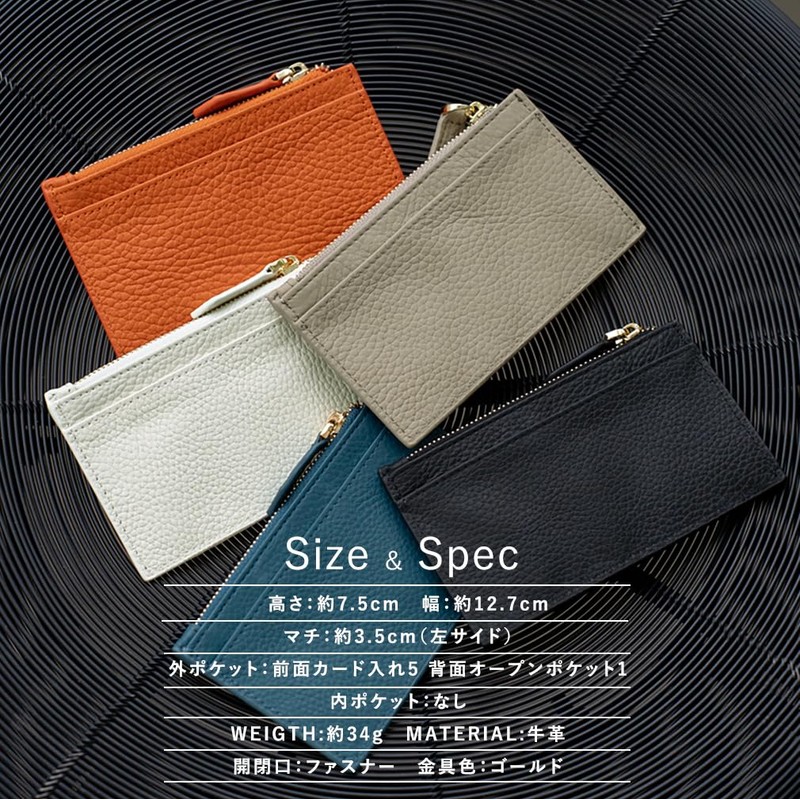 - ■Size etc. ●Size (H x W x D): Approx. 3.0 x 5.0 inches (7.5 x 12.7 x 12.7 x 3.5 cm); Outer Pockets: 5 front card slots, 1 rear open pocket; Inner pocket: None; Weight: Approx. 1.2 oz (34 g); Material: Cowhide leather; Main opening is a zipper. Metal fittings color: Gold