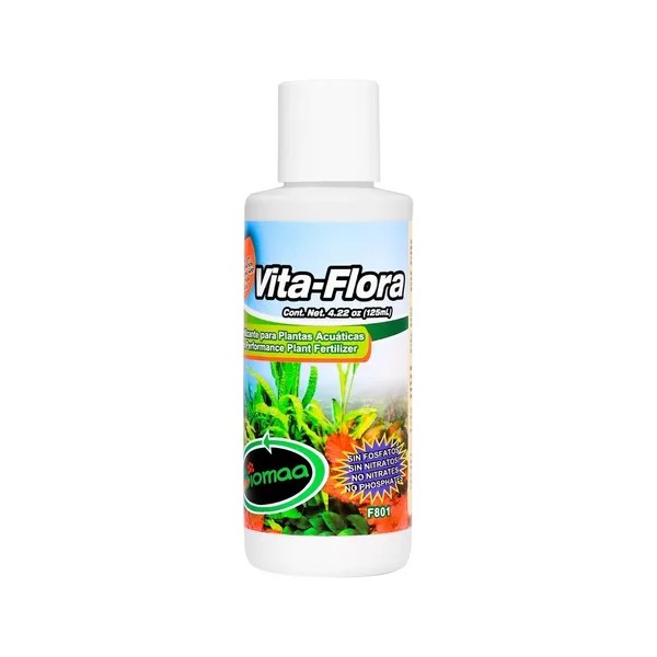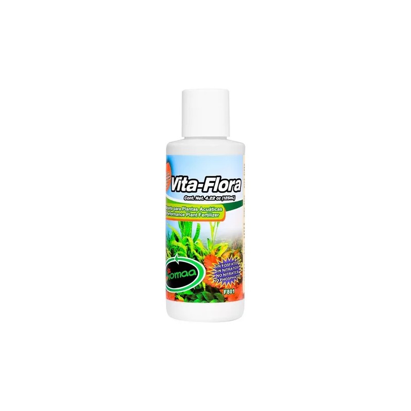 La fórmula de Vita-Flora, exenta de nitratos y fosfatos, evita el crecimiento de microalgas que pueden teñir los vidrios y el agua del acuario de verde o café. La ausencia de estos compuestos se debe a que se generan gradualmente en los acuarios a través de la alimentación y el metabolismo de los peces.