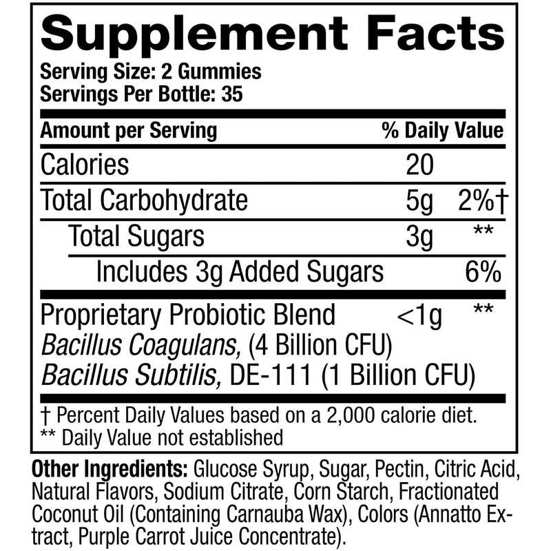 Gummies Provide: 5 Billion CFUs per serving and 2 Probiotic Strains with an