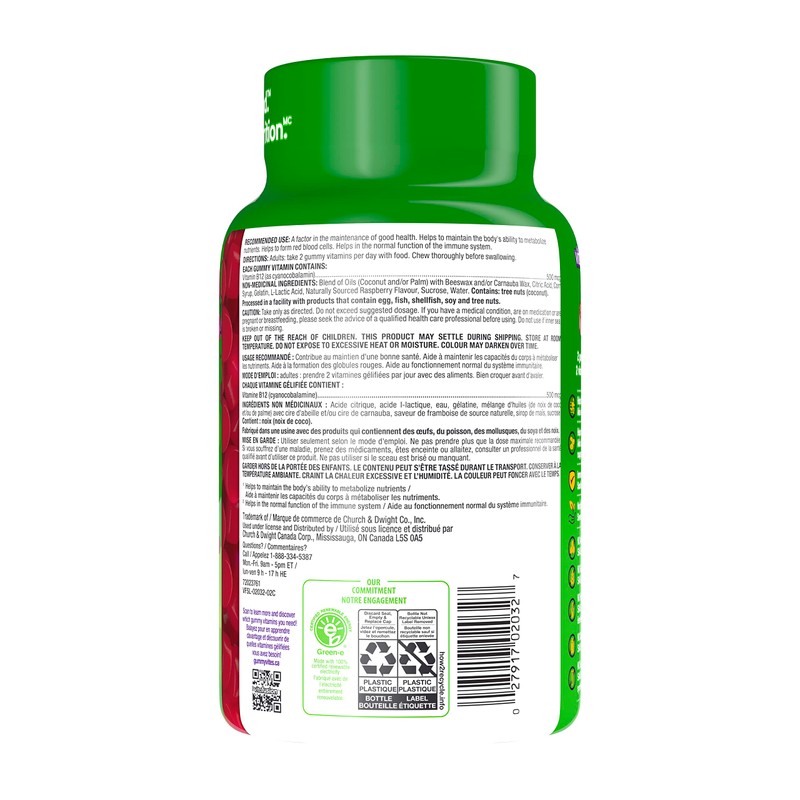 Vitafusion B12 Gummy Vitamins make nutrition taste good. They are an excellent source of Vitamin B12, designed to support energy metabolism for adults. Getting your daily recommended nutrients through diet alone can be challenging. Our B12 Gummy Vitamins are specially formulated for adults and provide 500-mcg of B-12 per serving to help the body metabolize carbohydrates, fats and proteins. These easy-to-take gummy vitamins are a perfect 'top-up' to help you feel great and support optimal health. Plus, our B12 Complex Gummy Vitamins contain no high fructose corn syrup, synthetic dyes or gluten, making them the nutritious and delicious solution for adults of any age. Vitafusion Gummies are easy to chew and can be taken without water for added convenience. The delicious, naturally sourced raspberry flavour makes remembering to take your vitamins easy. Vitafusion stands for enjoyable, delicious nutrition for all people, families and communities. Through our products, we deliver a variety of colorful, delicious, nutrient-rich options for individuals and families every day. This product may settle during shipping.