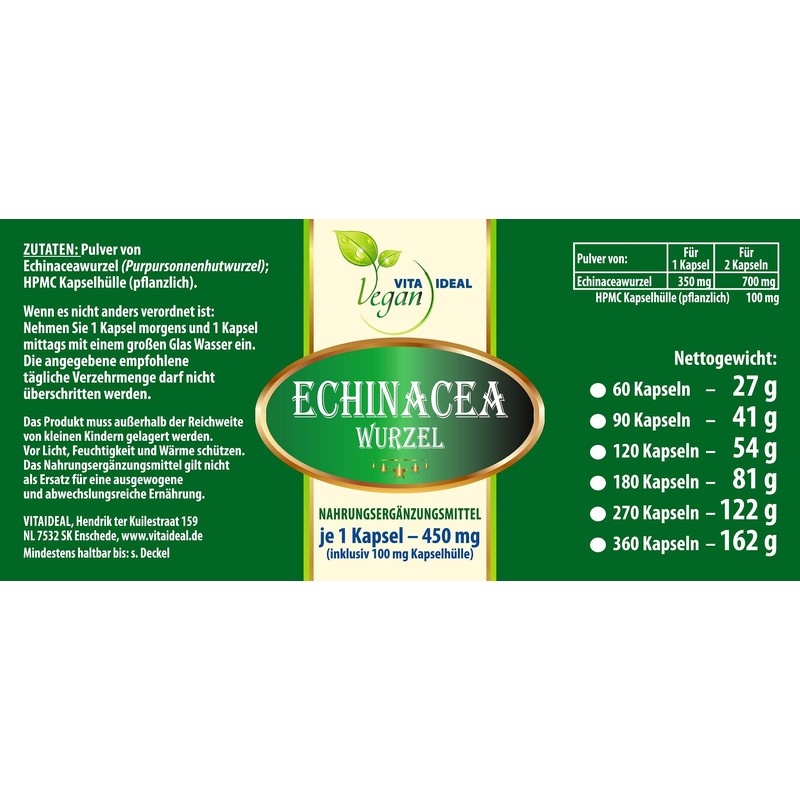 - Contents: Echinacea root powder, each 350 g (purple coneflower root), capsule shell made of HPMC (vegetable capsule shell) per 100 mg. Our powders are 100% natural and plant-based. No additives. Bottled in the Netherlands.