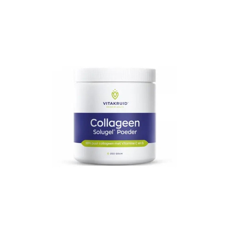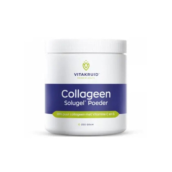 The VitaKruid Collagen Solugel® Powder is a super convenient supplement containing 99% pure collagen, enriched with vitamins C and D. Collagen is a naturally occurring protein in the body and plays an important role in the skin, bones, and cartilage.