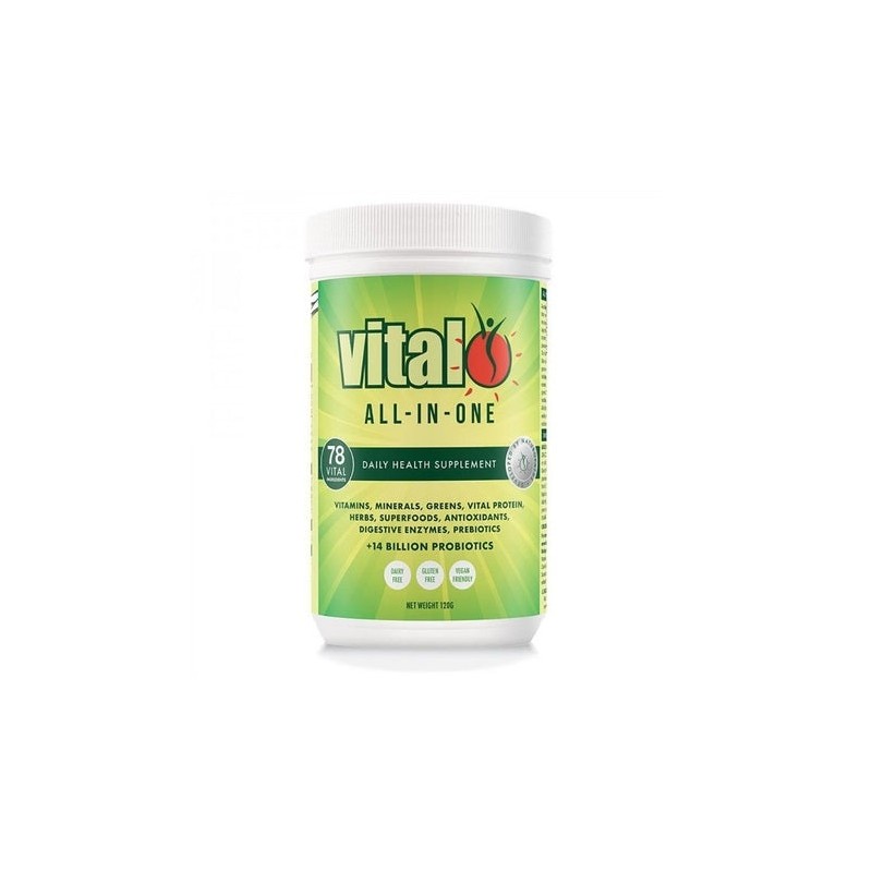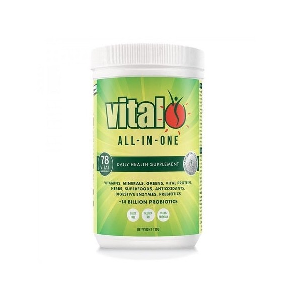 Vital Greens, now named Vital All-In-One, was the first product developed under the Vital Brand in early 2000. The formula is an easily absorbed, carefully balanced powder blend of essential nutrients that have been extracted from natural dense vegetables and fruits plus the addition of probiotics, herbs, vitamins and minerals. Recently the formula was renamed Vital All-In-One to highlight the product is more than greens, emphasising it is a comprehensive supplement. Just two teaspoons daily of Vital All-In-One delivers 78 vital ingredients that are loaded with probiotics, prebiotics, vitamins, minerals, antioxidants, essential fatty acids, fibre and a unique high alkalising pea protein.