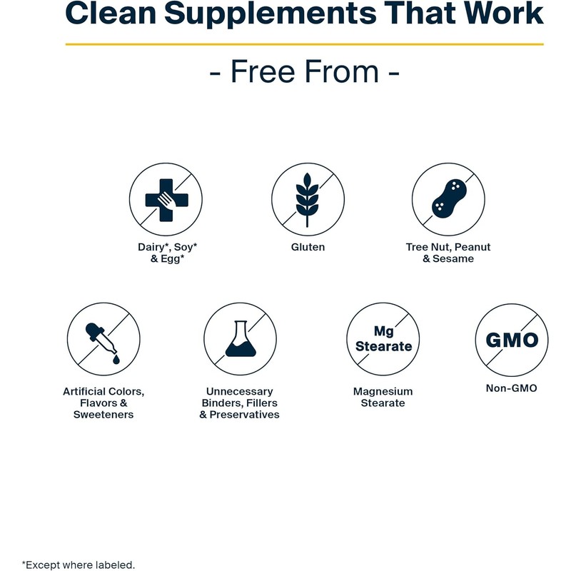 - Clean Formula: Free from gluten, dairy, peanut, tree nut, shellfish, soy, sesame, and egg. Non-GMO. Made without artificial fillers, coatings, binders, or colors