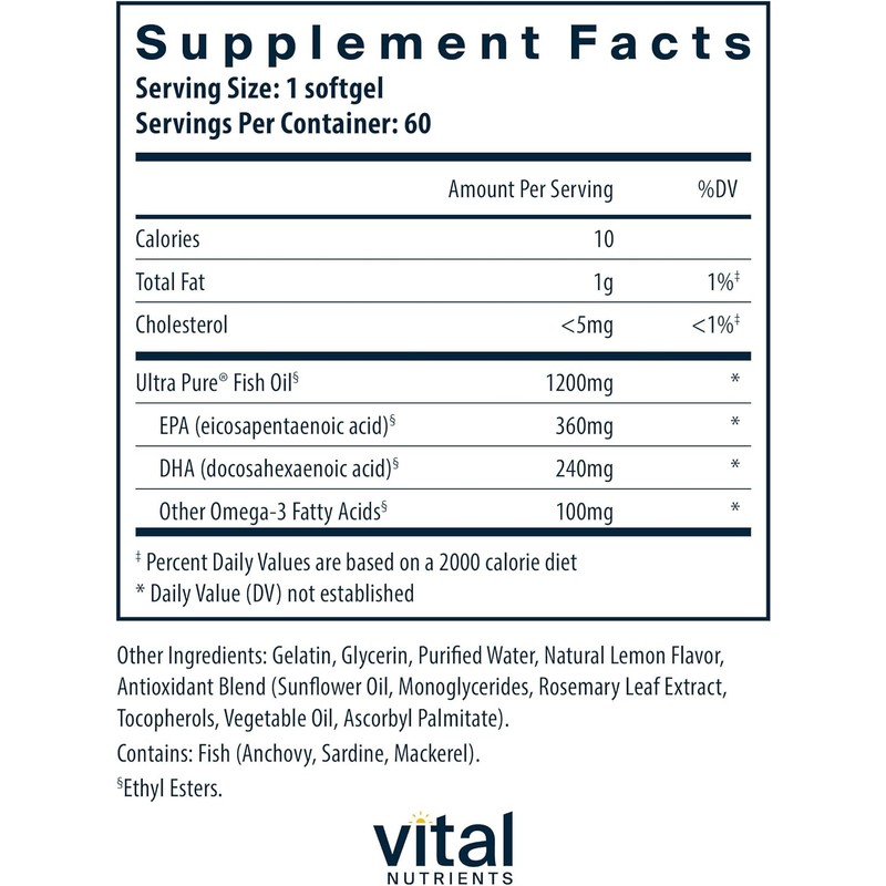 Vital Nutrients Ultra Pure® Fish Oil 700 | Supports Heart, Brain, and Joint Health* | Sustainably Sourced High EPA & DHA Omega-3 Fatty Acid | Lemon Flavor | Gluten, Dairy & Soy Free | 60 Softgels