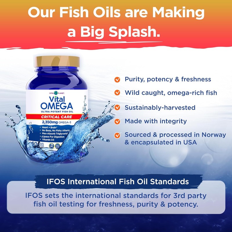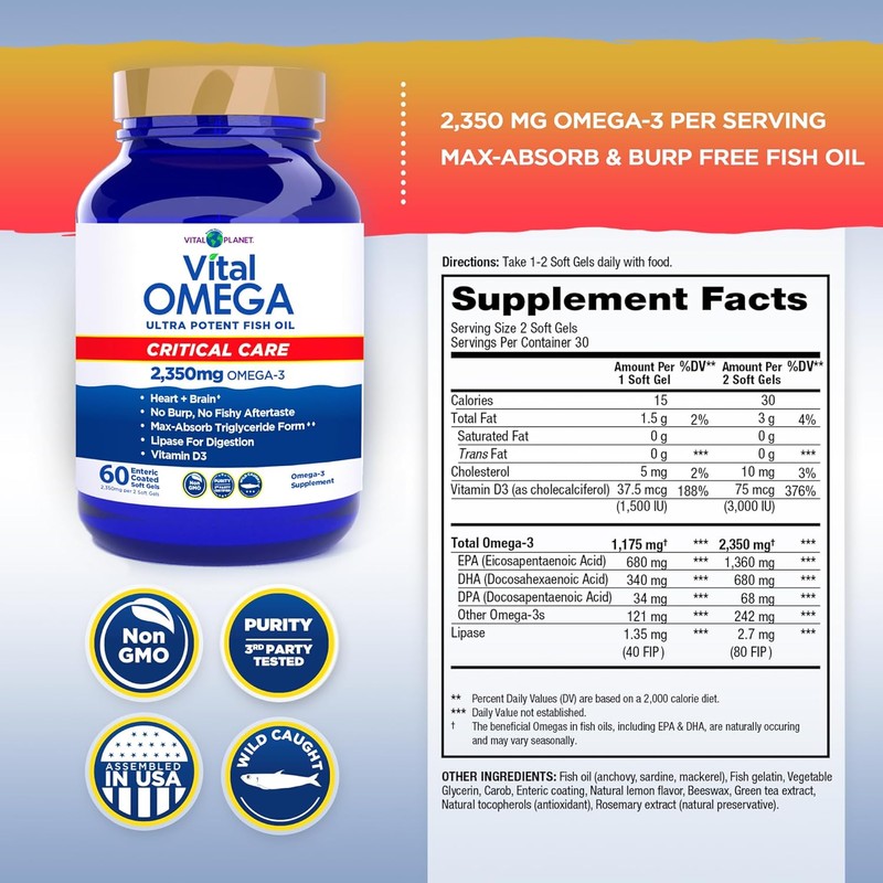 - Ultra Potent, Powerful, and Pure - Vital Omega Critical Care fish oil supplement contains 2,350 mg Omega-3 EPA, DHA, and DPA per serving (2 Softgels) and is enhanced with Vitamin D3. It’s highly concentrated with 3X more Omega-3 per Softgel than standard fish oil supplements, providing more potency in fewer servings. Vital Omega Critical Care is Vital Planet’s most potent daily Omega-3 supplement to support heart and brain health as we age.*