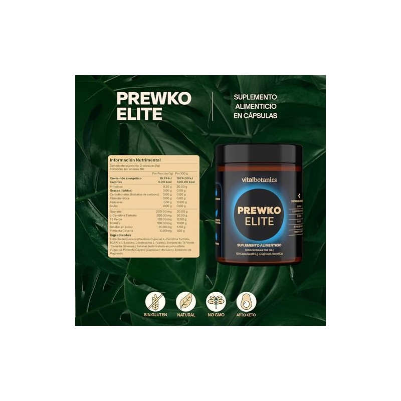 VITALBOTANICS - Preworkout Elite 120 Cpsulas - Pre Entreno - Suplemento Alimenticio con BCAAs, L-Carnitina y Extractos Naturales - Energa