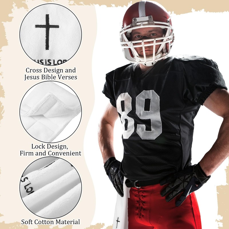 - Faith Cross Football Towel: these Christian football towels feature a Christian cross design and include uplifting Bible verses, the cross and inspiring words will remind players of their faith, bringing them hope, strength, and confidence to face any challenge in the game