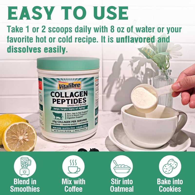 Vitalibre Bovine Collagen Peptides Powder for Women and Men, Grass-Fed Hydrolyzed Collagen Protein Type I & III, Skin, Hair, Nails, Bones, Digestion, Unflavored, Non-GMO, Keto & GF, 22 Servings, 16oz