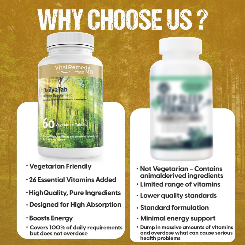 - HIGH QUALITY FORMULA: Crafted with purity and quality, Vital Remedy Daily2Tab's high-quality formula supports wellness and energy. Each tablet is a testament to our commitment to quality, combining pure, essential vitamins with chelated minerals to support health.