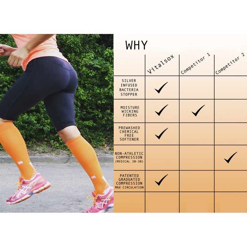 - BEST COMPRESSION RANGE, Vitalsox uses compression for maximum circulation and comfort this IDEAL range is the most beneficial for Running, Crossfit, Walkers, Pregnancy, Maternity, Vein Support, Marathons, Sports, Gym, Yoga, Spartan, Standing, Working, Sitting, or Sleeping, Always Increasing Stamina and Faster Recovery, For more compression size down one size in the size chart.