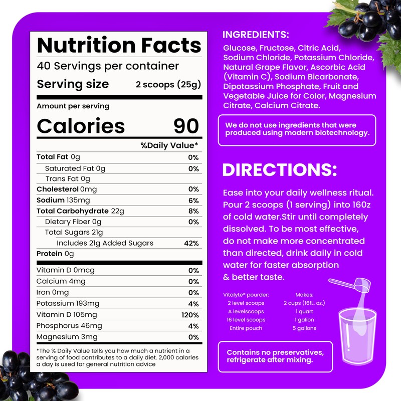 Vitalyte Vitalyte Electrolyte Powder Drink Mix, Isotonic Electrolyte Hydration Mix, Gluten Free Post Workout Powder Mix, Pack of 1, 35 oz., Grape Flavor