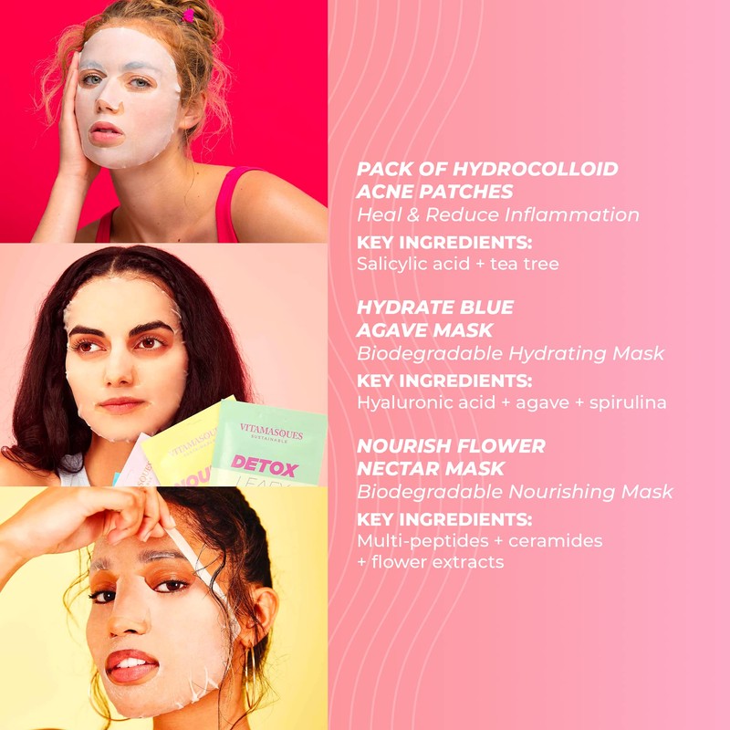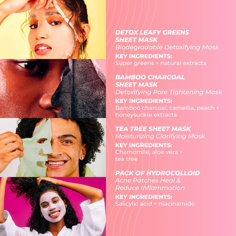 - Acne Kit: The Skin Saver Acne Kit includes everything you need for smooth, acne-free skin. This kit comes with 1 Detox Leafy Greens Biodegradable Mask, 1 Bamboo Charcoal Sheet Face Mask, 1 Tea Tree Sheet Face Mask, 1 Hydrocolloid Acne Patches Salicylic & Tea Tree, 1 Hydrocolloid Acne Patches Salicylic & Niacinamide, 1 Hydrate Blue Agave Biodegradable Mask, and 1 Nourish Flower Nectar Biodegradable Mask.