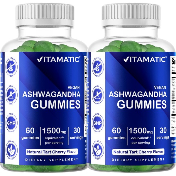 2 Pack Vitamatic Ashwagandha Gummies 1500 mg Equivalent Per Serving (from 30:1 Extract 50 mg) - 60 Vegan Gummies - 3% Withanolides