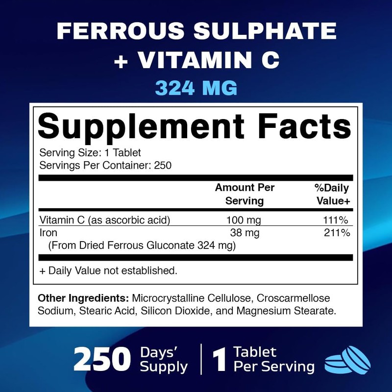Convenient Daily Use: Our 324 mg tablets are designed for daily use, making it simple to meet your iron requirements without the hassle of large pills. Maintain your health effortlessly with our easy-to-swallow tablets.