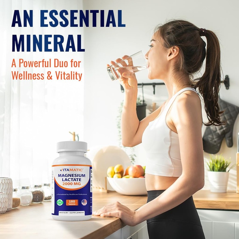 Vitamatic Magnesium Lactate 2000mg per Serving – 180 Tablets – Supports Muscle, Heart, Bone & Nervous System Health* – Non-GMO, Gluten Free, No Artificial Additives