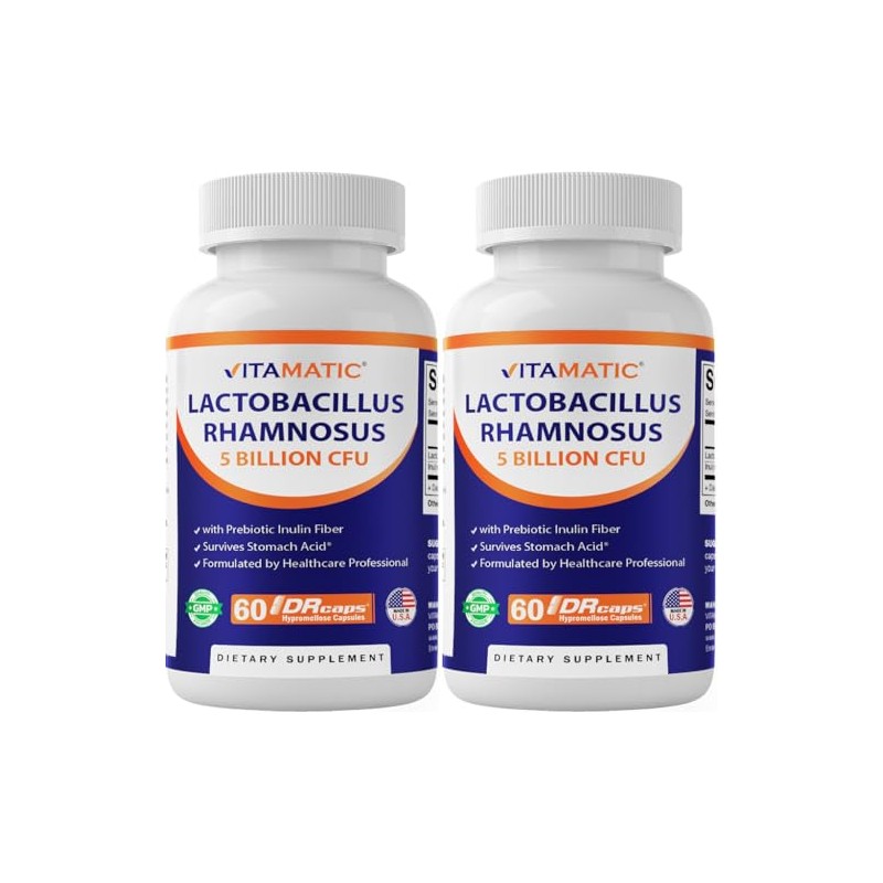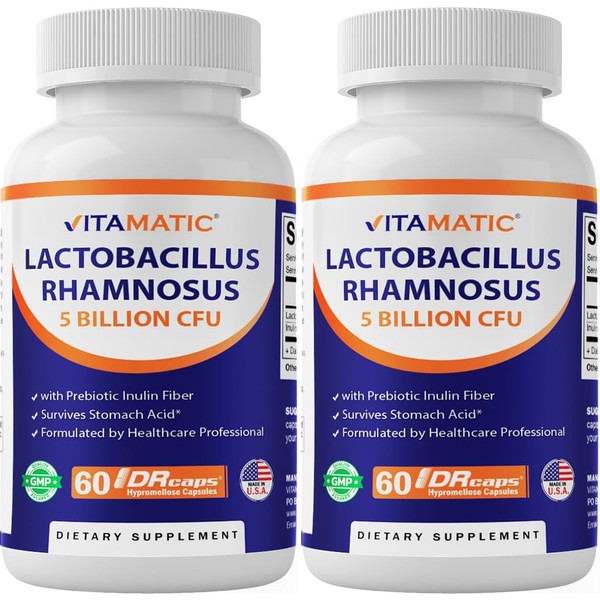 Vitamatic Lactobacillus Rhamnosus 5 Billion per DR Capsule (10 Billion Per 2 Capsules) - 60 Count - Advanced Digestive & Immune Support - Made with Prebiotic Inulin Fiber- 2 Pack