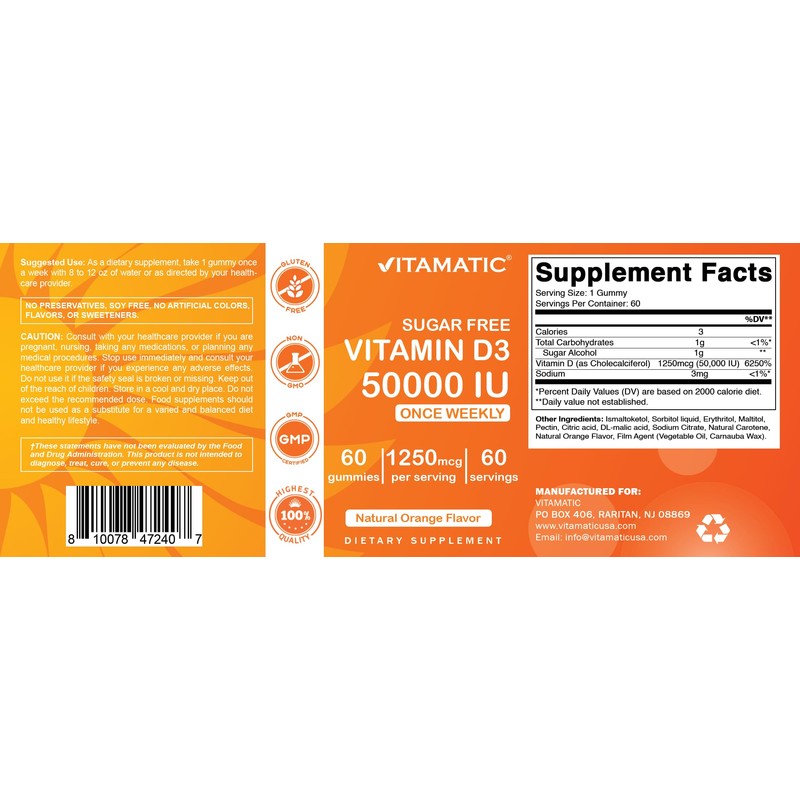 Vitamatic Sugar Free Vitamin D3 50,000 IU Weekly Supplement – 60 Pectin-Based Gummies - 2 Pack High-Potency Vitamin D for Bone, Teeth & Immune Support