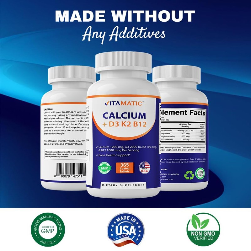 - COMPREHENSIVE FORMULA: This calcium supplement contains 1200mg of calcium, 2000IU of vitamin D3, 100mcg of vitamin K2, and 1000mcg of vitamin B12 (methylcobalamin).