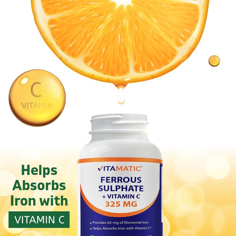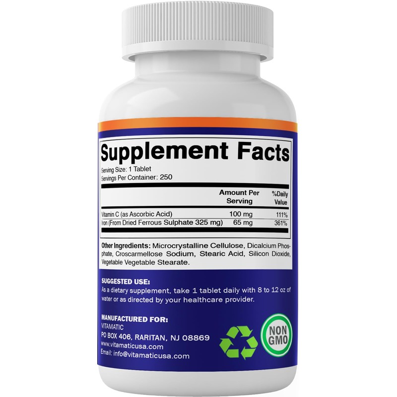 Vitamatic Ferrous Sulphate 325 mg + Vitamin C 100 mg - (65 mg Elemental Iron) High Potency Iron Supplement | No Artificial Color Additives - 250 Tablets Made in USA