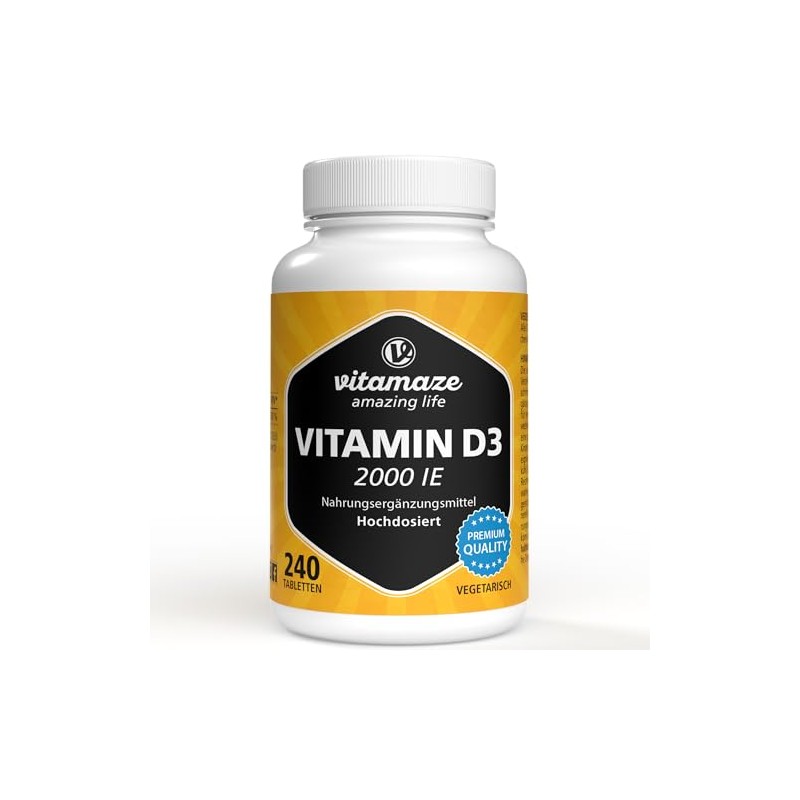 - HOCHDOSIERT: 240 vegetarische Tabletten mit 2.000 IE (Internationalen Einheiten) pro Tablette. Vitamin D trägt zur Erhaltung normaler Knochen und Zähne sowie der normalen Muskelfunktion und Immunfunktion bei.