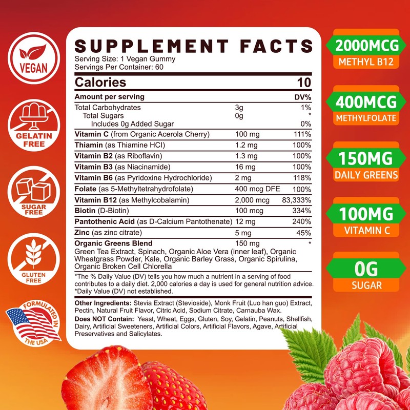 - Energy, Immunity & Brain Health: Whether you're managing a busy household, frequent meetings or business trips, or working out, these B complex vitamins for women & men gummies will keep you energized. Packed with all 8 B vitamins, plus vitamin C, zinc & 8 organic greens, they help you convert food into energy for healthy energy levels & immunity, and overall vitality—helping you take on daily challenges with ease. Enjoy a delicious, tooth-friendly treat that fuels your well-being!
