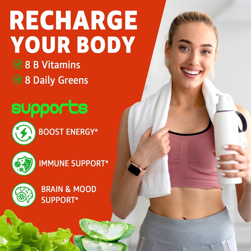 - Enhanced with 8 Organic Greens: These b vitamins complex gummies are infused with a powerful blend of 8 daily greens—green tea, spinach, aloe vera, spirulina, wheatgrass, chlorella, kale, and barley grass. They work synergistically with b complex vitamins to support immunity, energy, digestion, and overall vitality. It's like a symphony of nutrients that work together to keep you at your best. A perfect boost for your busy lifestyles!