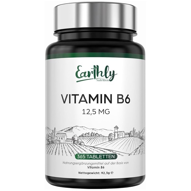 Vitamin B6 12.5 mg, 365 vegan tablets, contributes to a healthy metabolism, normal function of the nervous and immune system, contributes to the reduction of fatigue. Earthly Nutrition