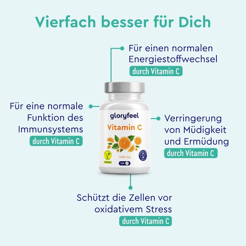 Vitamin C 1000 mg - High Dose Vegan Tablets for Immune System & Energy