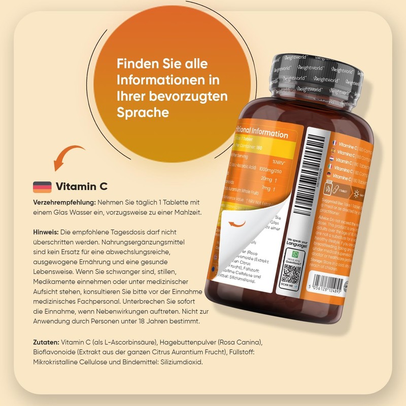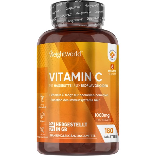 Vitamin C 1000 mg per tablet - 180 vegan tablets for 6 months - Vit C as L-ascorbic acid with bioflavonoids and rose hip - WeightWorld