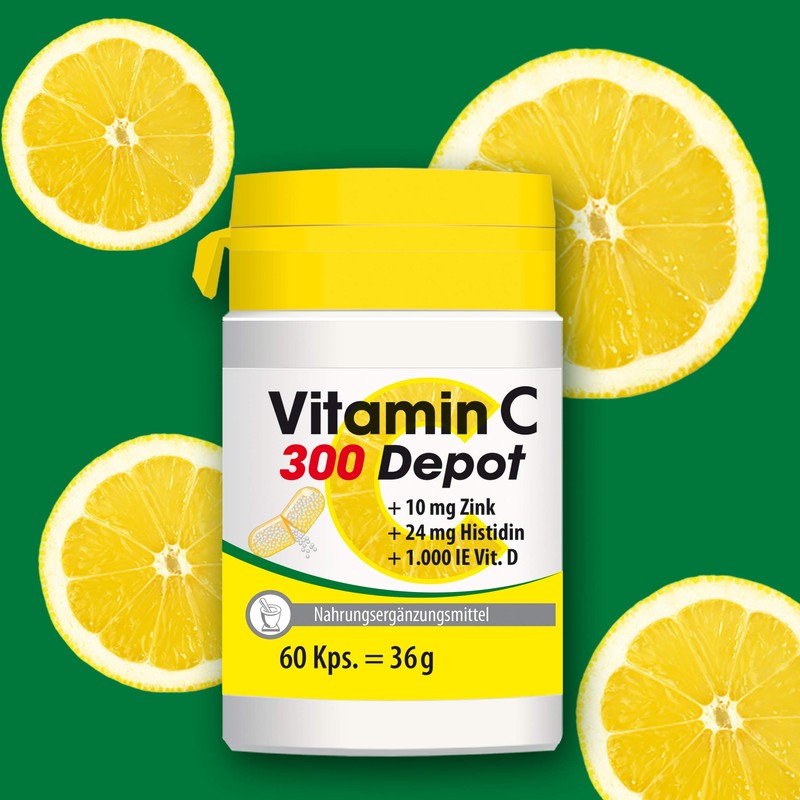 Vitamin C 300 Depot + Zinc + Histidine + Vitamin D Capsules, for a Healthy Immune System, Long-Lasting Depot Effect, Laboratory Tested, Made in Germany