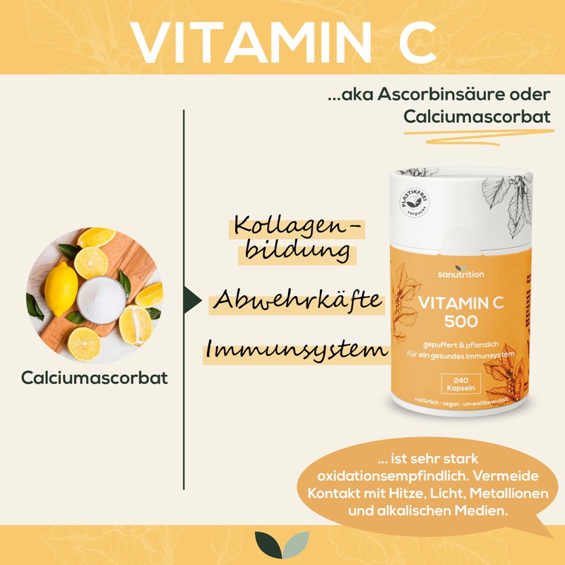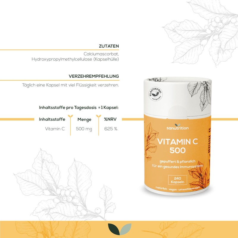 - Premium vitamin C: Sanutrition vitamin C 500 mg per capsule buffered and plant-based. 240 capsules per paper can. In addition, each capsule is purely natural, vegan and gluten-free. The vitamin C capsules impress with their best bioavailability and compatibility.