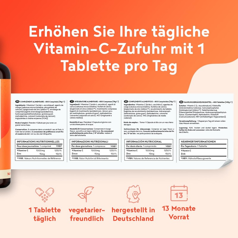 Vitamin C High Dose 1000mg + Zinc 15mg - 365 Tablets for 1 Year - Laboratory Tested, Vegan and No Unnecessary Additives - Made in Germany - Support of the Immune System - Alpha Foods