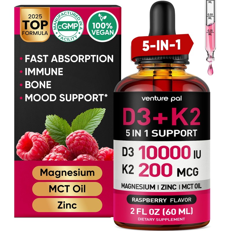 Venture Pal 5-in-1 Vitamin D3 10000 IU & K2 as MK-7 200mcg with Magnesium, MCT Oil, Zinc, Sugar-Free Vitamin D Liquid |Maximum Absorption for Bone, Mood & Immune Health - 2 FL OZ, 60 Days