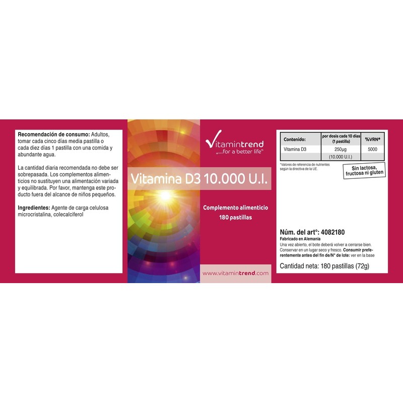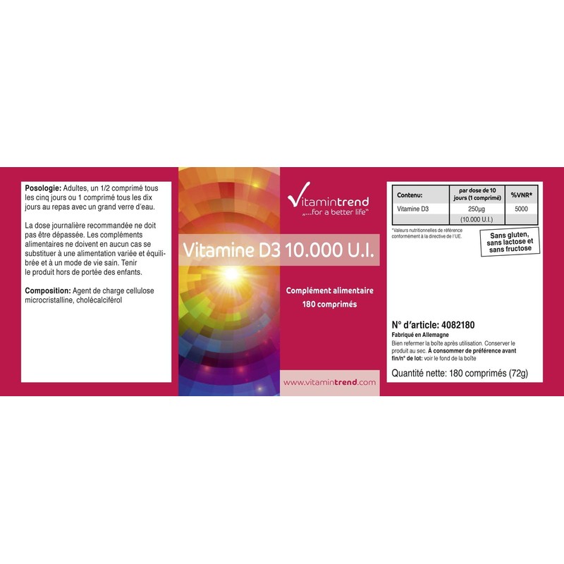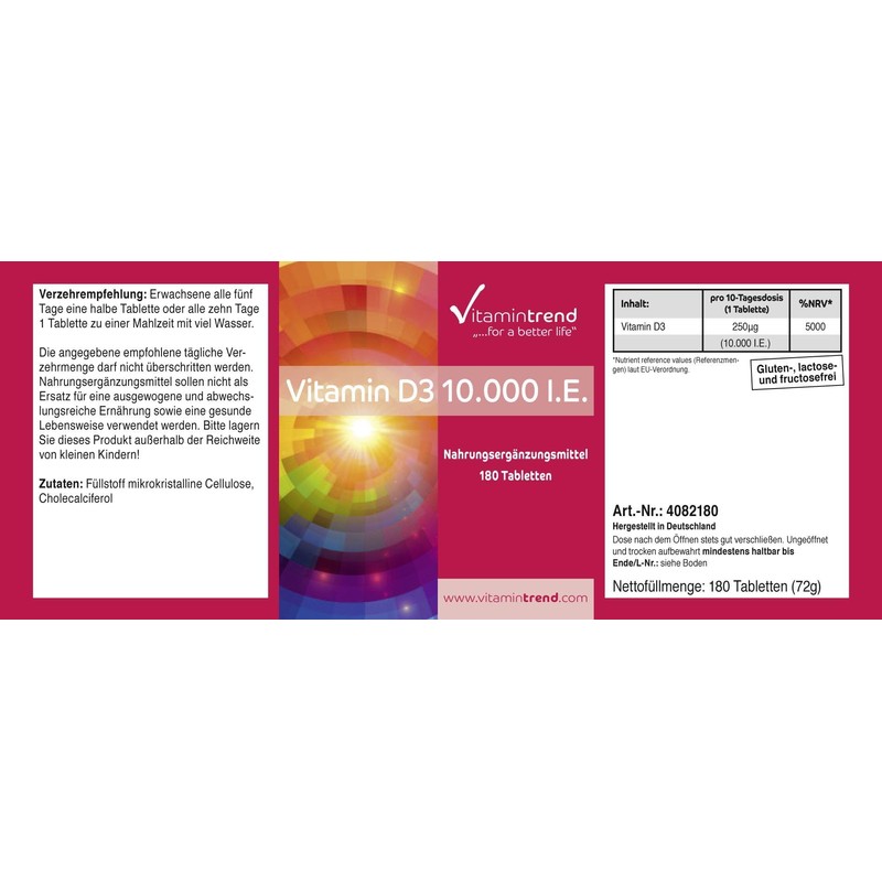 - Vitamin trend German quality. One tablet contains: 250µg (10000 IU.) Vitamin D3 - recommended daily dose: half a tablet every five days or 1 tablet every ten days with a meal with plenty of water - highly dosed active ingredient - excellent value for money. Vitamin D contributes to a normal absorption/utilisation of calcium and phosphorus and to the maintenance of normal bones and teeth.