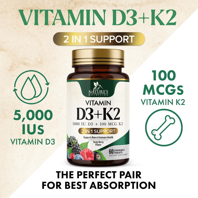 Vitamin D3 K2 Supplement | 5000 IU D3 + K2 100 mcg | MK-7 K2 with Vitamin D | Supports Immune, Heart, Teeth & Bone Health - Nature's Easy to Chew, VIT D3 K2, Non-GMO, Tasty Berry Flavor - 60 Tablets