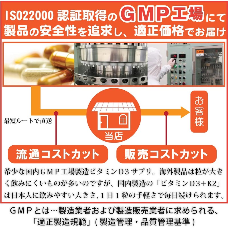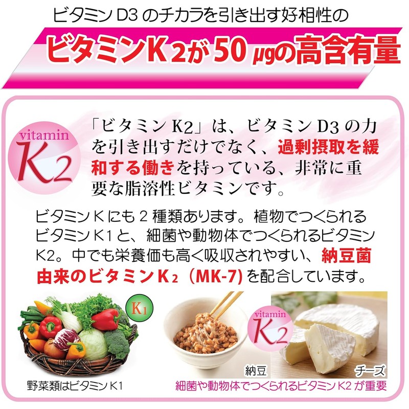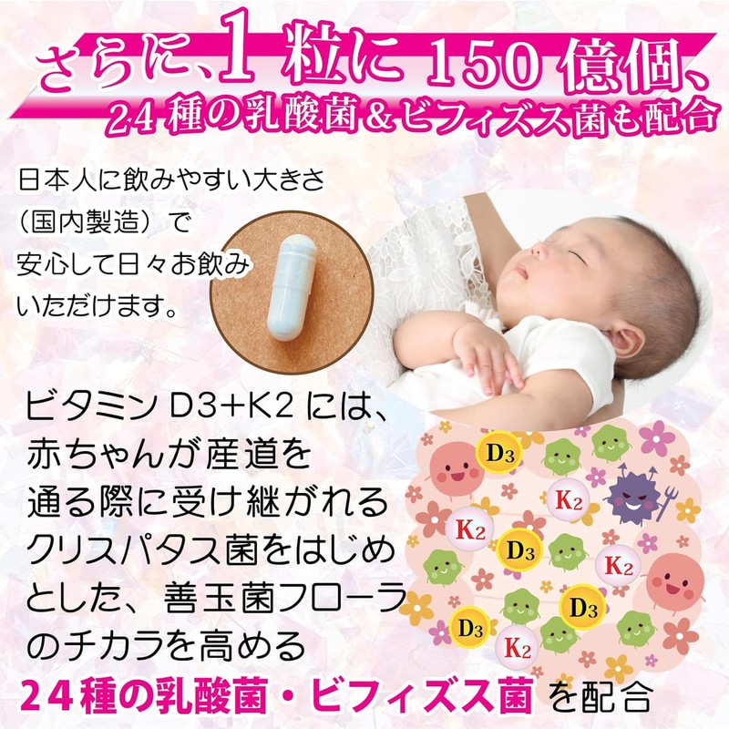 - Each tablet contains 1,200 IU (30μg) of vitamin D3, 50μg of vitamin K2, which enhances the power of vitamin D3 when taken together, and 15 billion lactic acid bacteria and bifidobacteria of 24 species derived from humans, animals, and plants, primarily crispatus bacteria, which are passed on to babies as they pass through the birth canal, to boost the power of the beneficial bacterial flora. Manufactured in a domestic GMP factory, this tablet is available in a Japanese size that is easy to take for daily prevention.