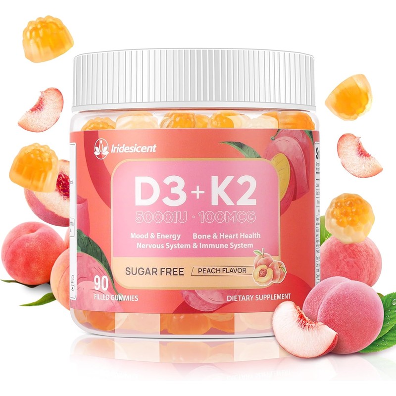 Vitamin D3 K2 Gummies with Magnesium – 5000 IU D3 + 100 mcg K2 (MK-7) – Sugar-Free Vegan Supplement for Women & Men – Peach Flavor – 90 Count