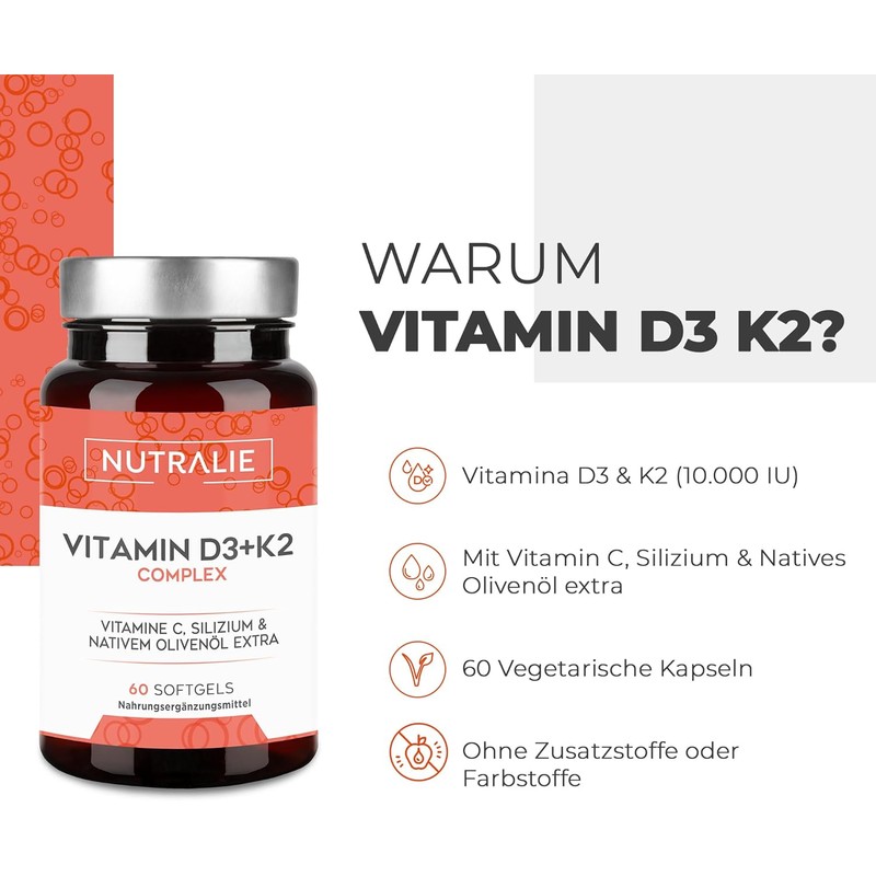 - Complete formula with vitamin C, silicon and olive oil. Nutralie Vitamin D3+K2 formula has been specially formulated to take advantage of the perfect addition to the benefits of both vitamins together. In addition, vitamin D3 and K2 from Nutralie are supplemented with the benefits of vitamin C, silicon and extra virgin olive oil.